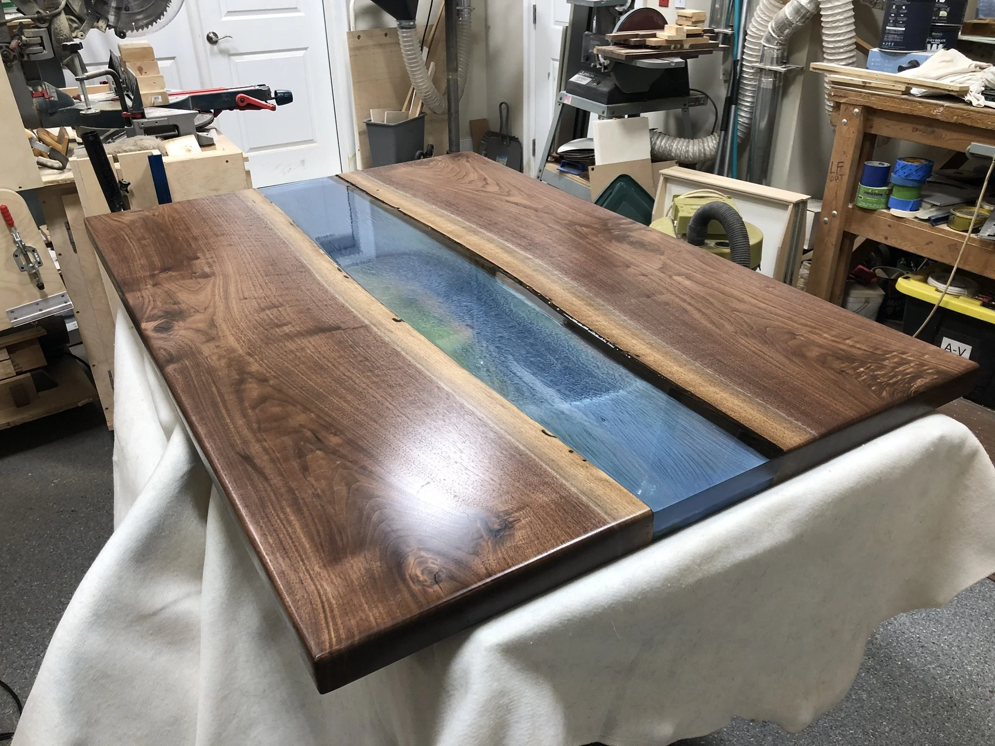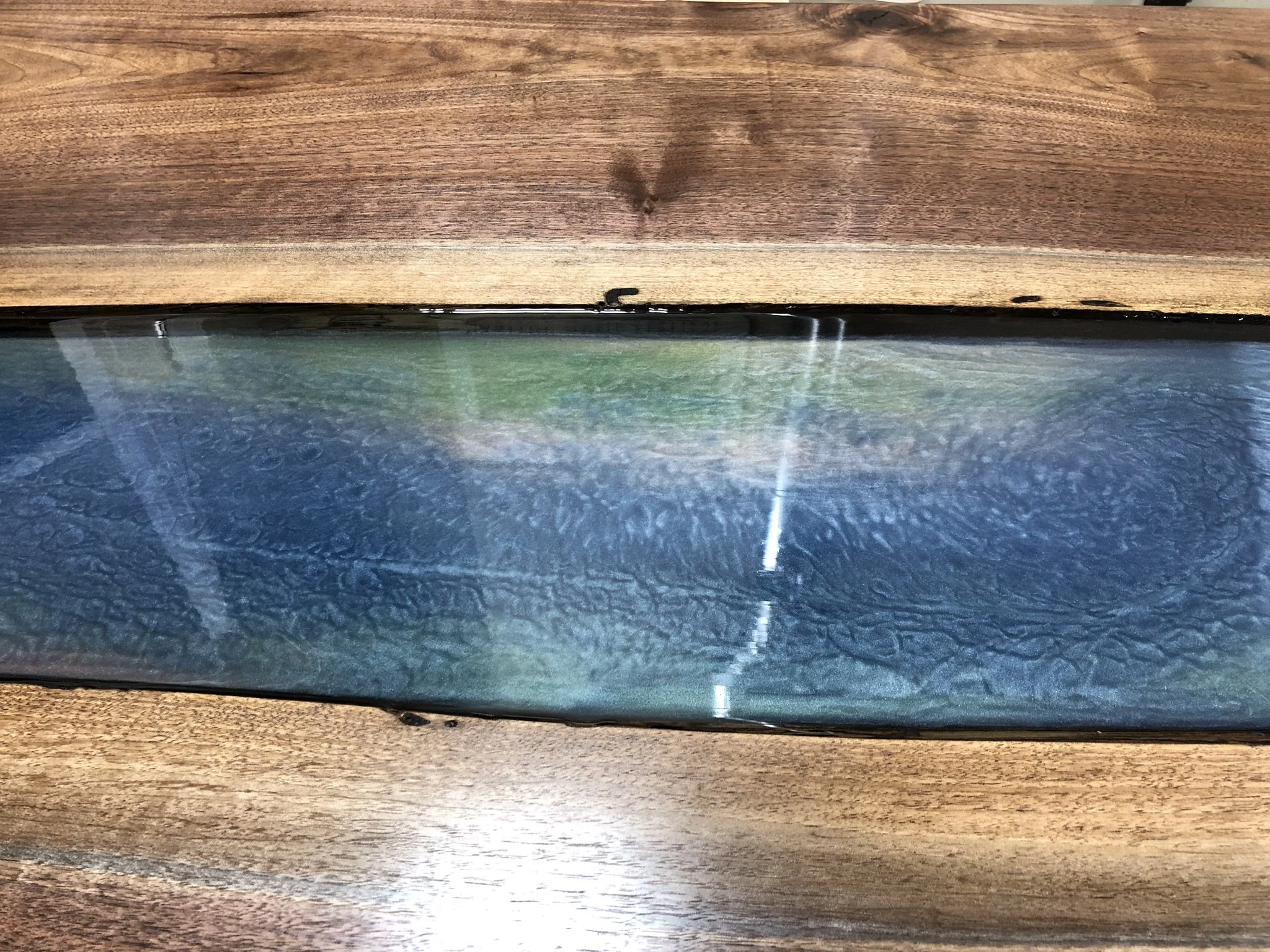 I’m making a video of each step of the build process for this local Walnut coffee table. The client wanted us to color the epoxy to match her painting of a wilderness river flowing through trees. We’re currently waiting for the legs to be powder-coated, so the table top itself is still in my workshop.