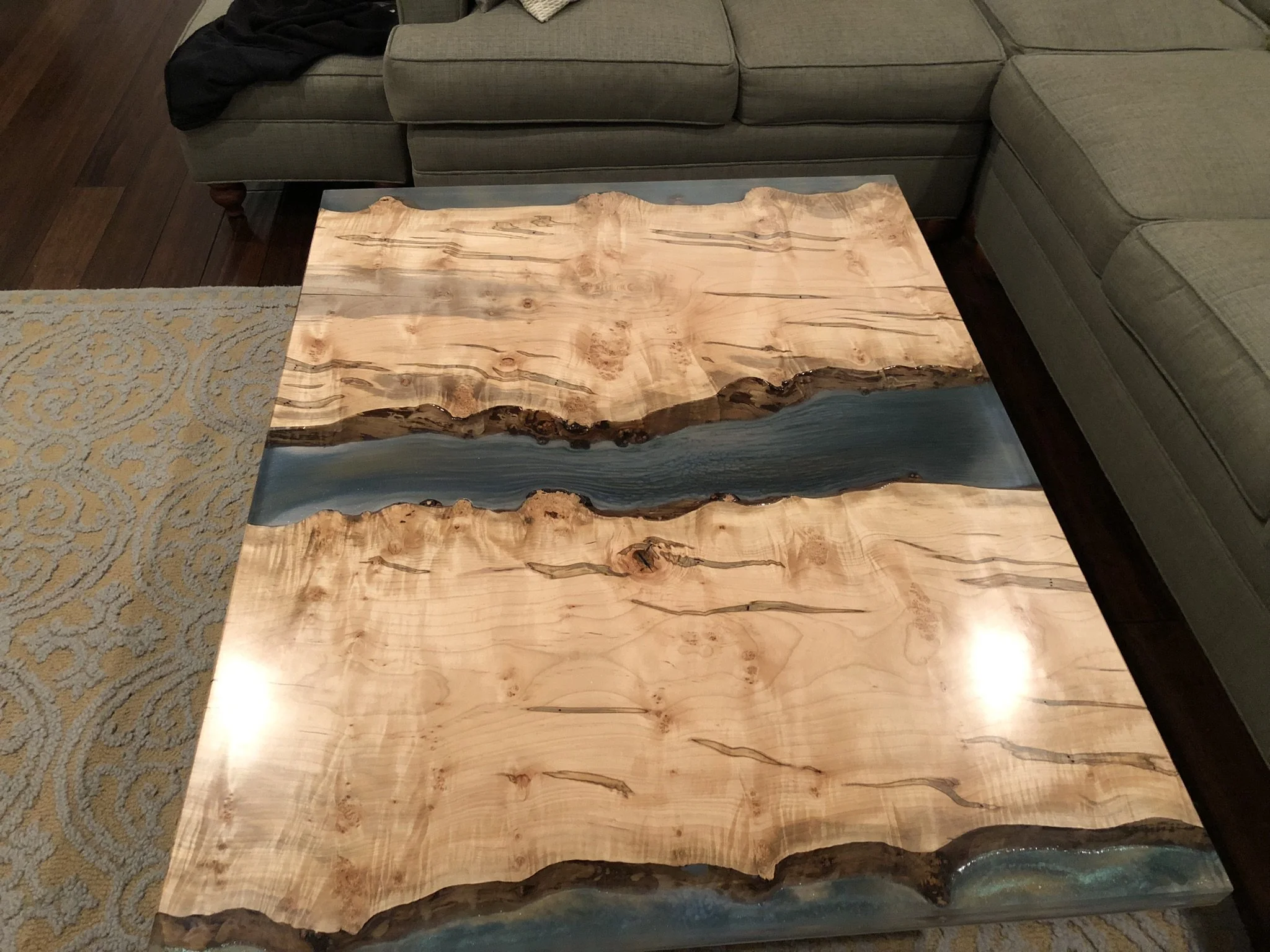 We made this coffee table for our Charlotte living room, using a gorgeous slab of double-live edge Ambrosia Maple